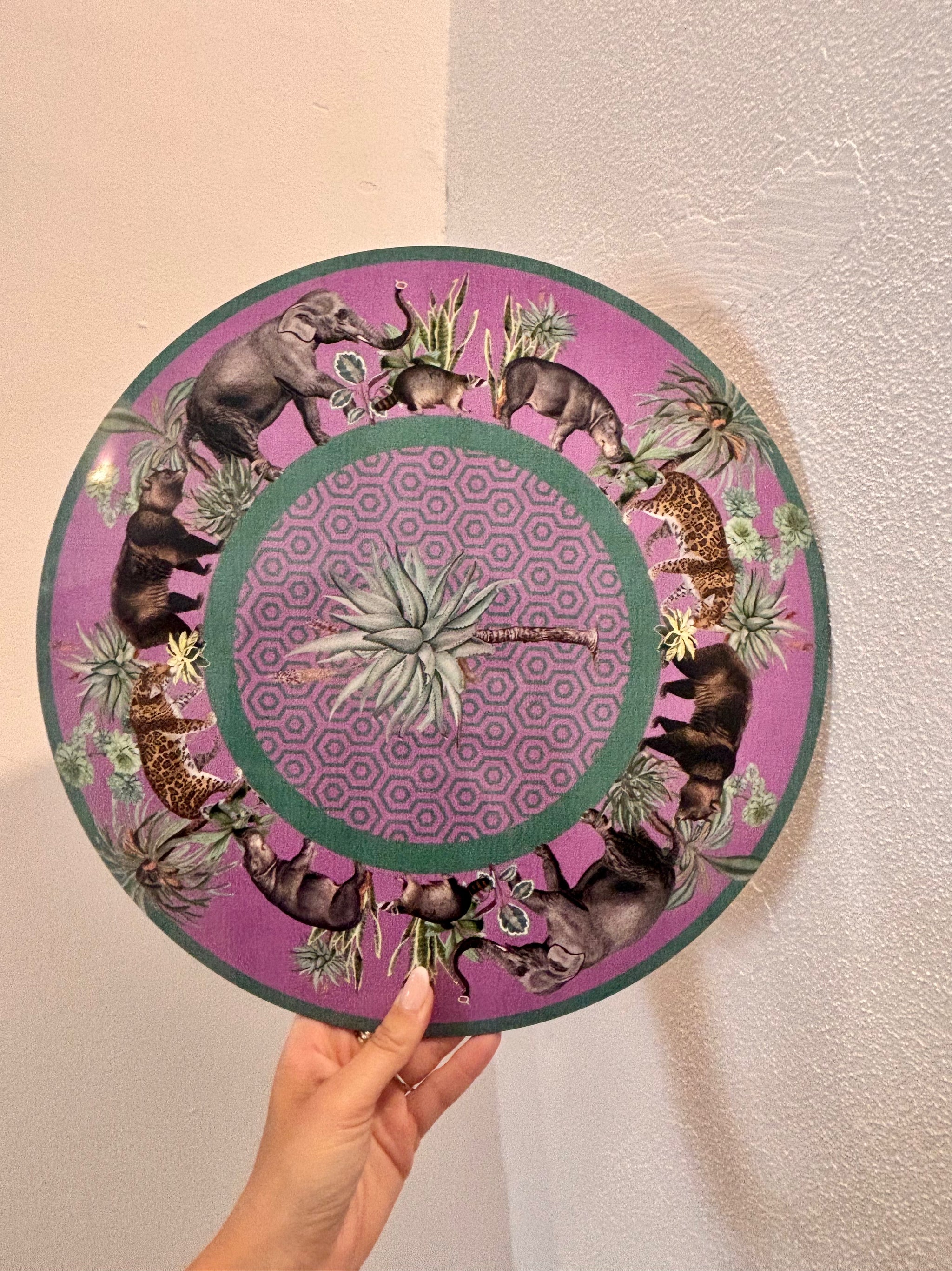 Un cerchio simbolico che unisce natura, animali e geometria: il sottopiatto “Tribal Circle” mescola eleganza esotica e ritmo visivo. Elefanti, giaguari, ippopotami e piante tropicali danzano attorno a una texture centrale geometrica che richiama i motivi etnici.