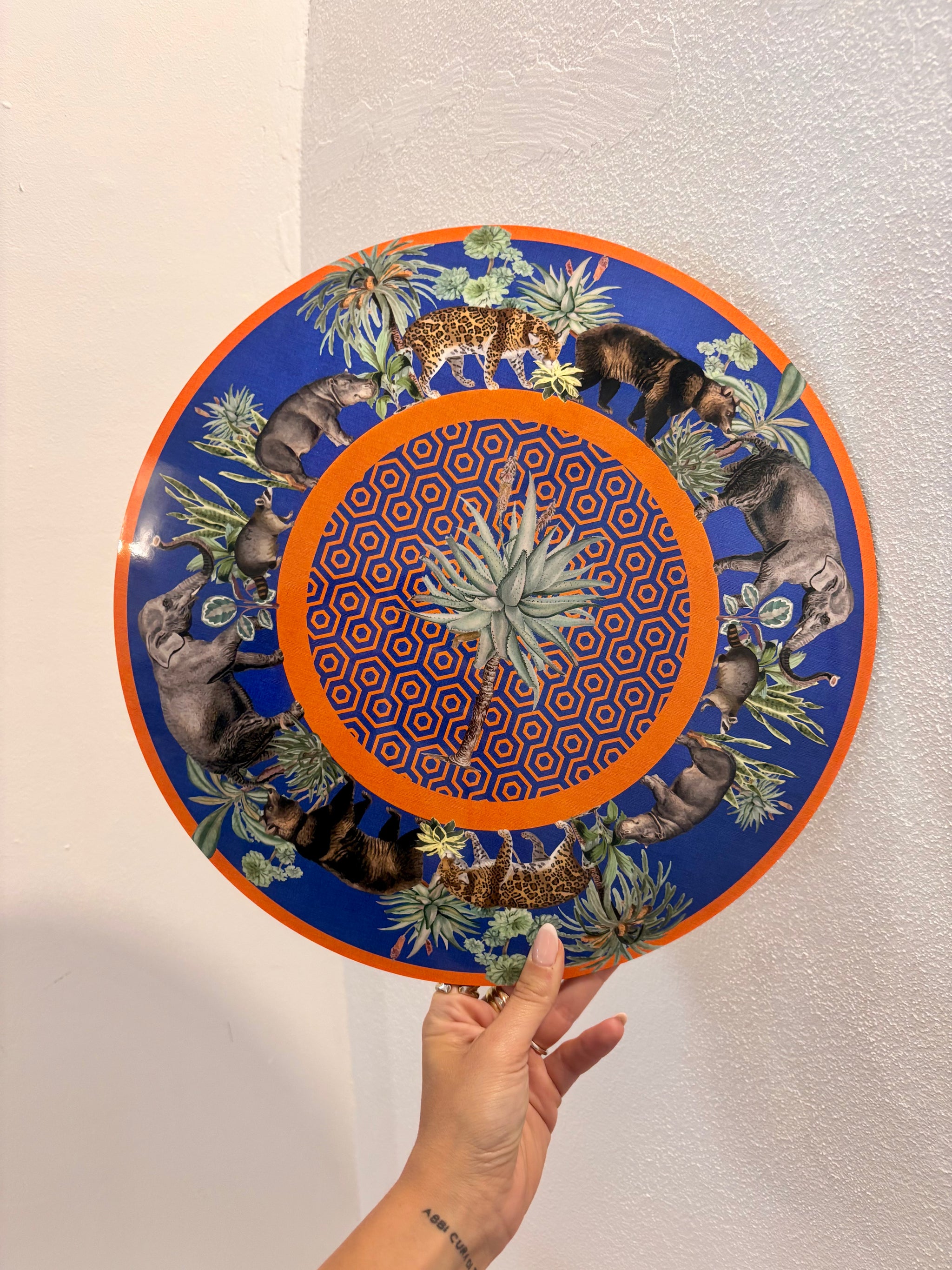 Un cerchio simbolico che unisce natura, animali e geometria: il sottopiatto “Tribal Circle” mescola eleganza esotica e ritmo visivo. Elefanti, giaguari, ippopotami e piante tropicali danzano attorno a una texture centrale geometrica che richiama i motivi etnici.