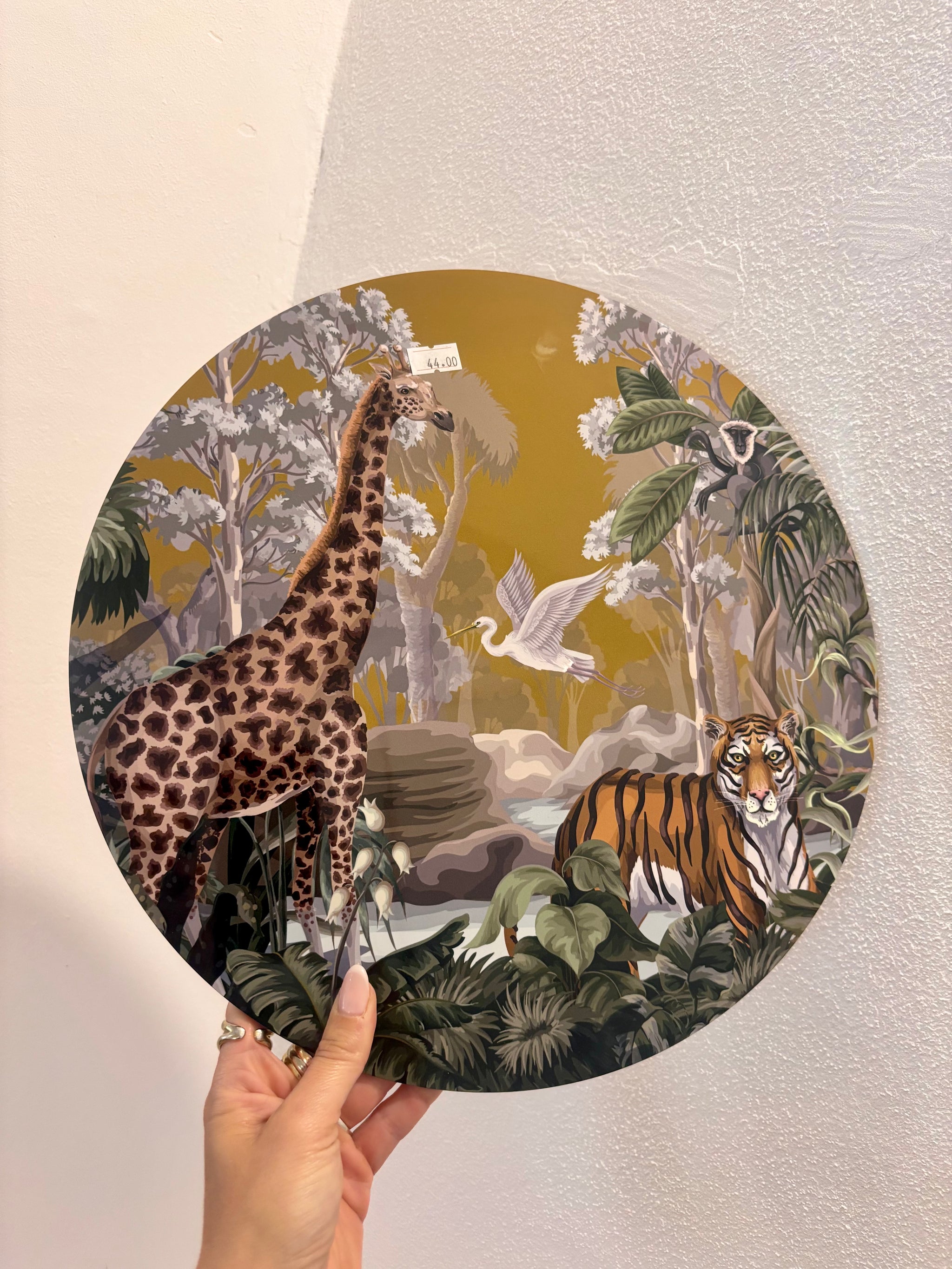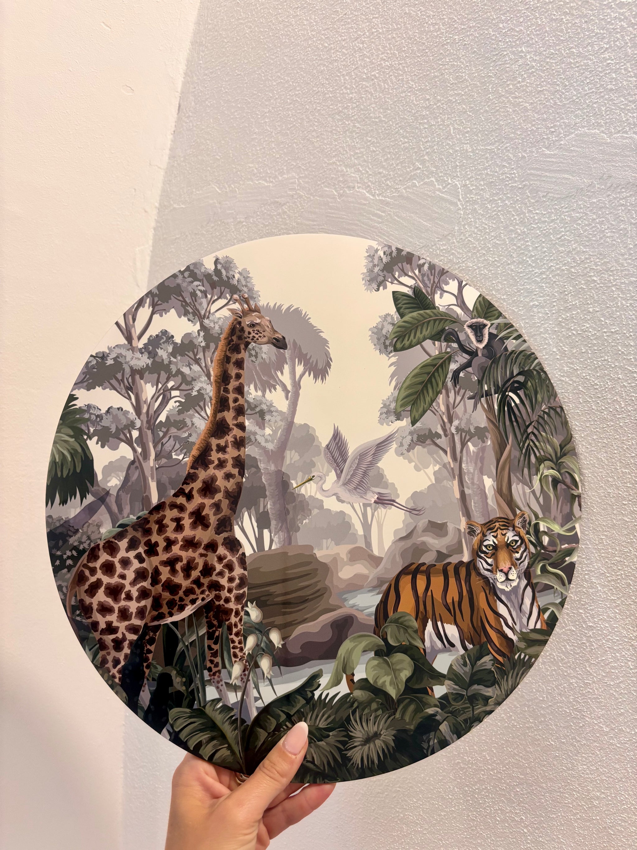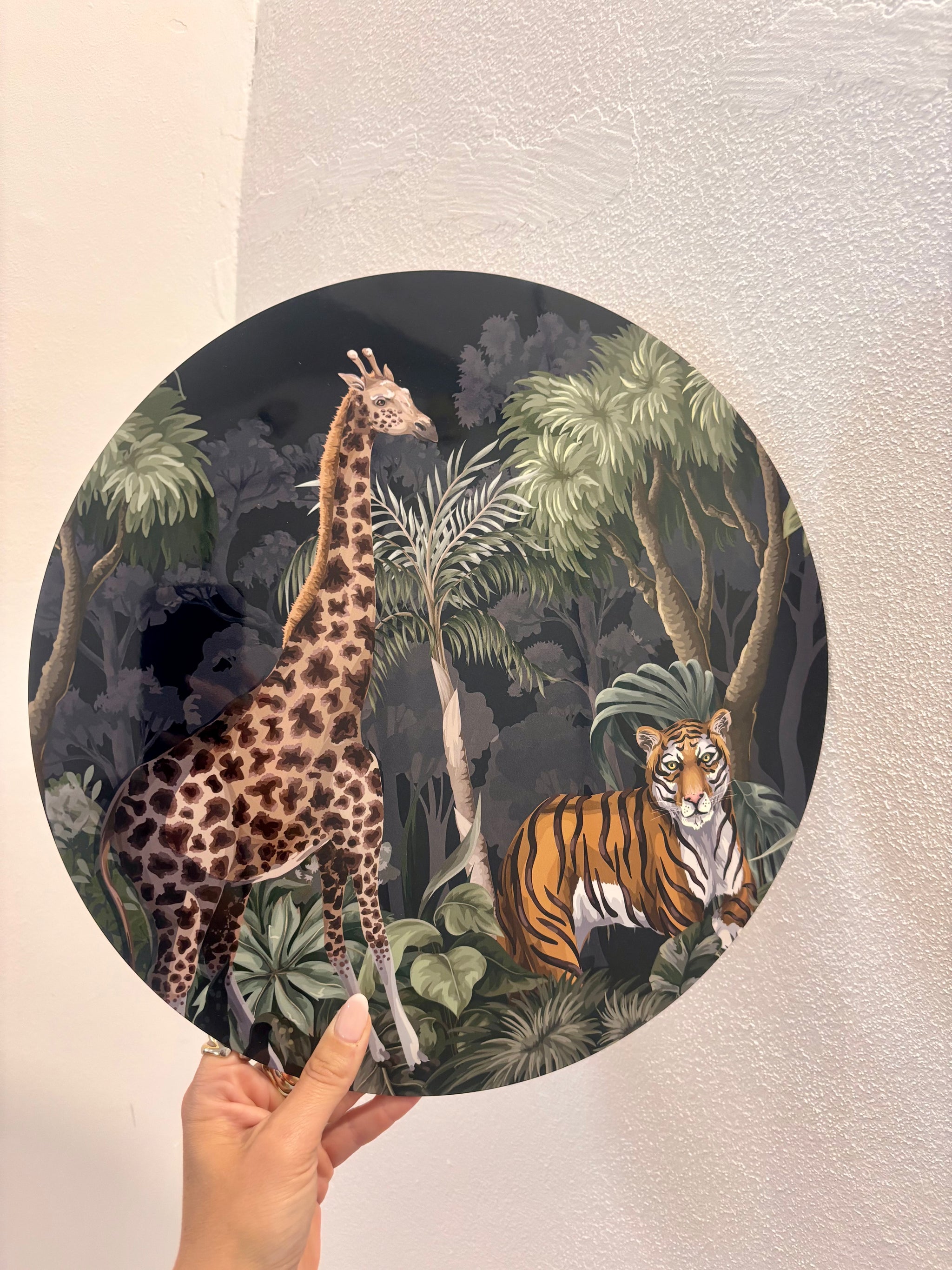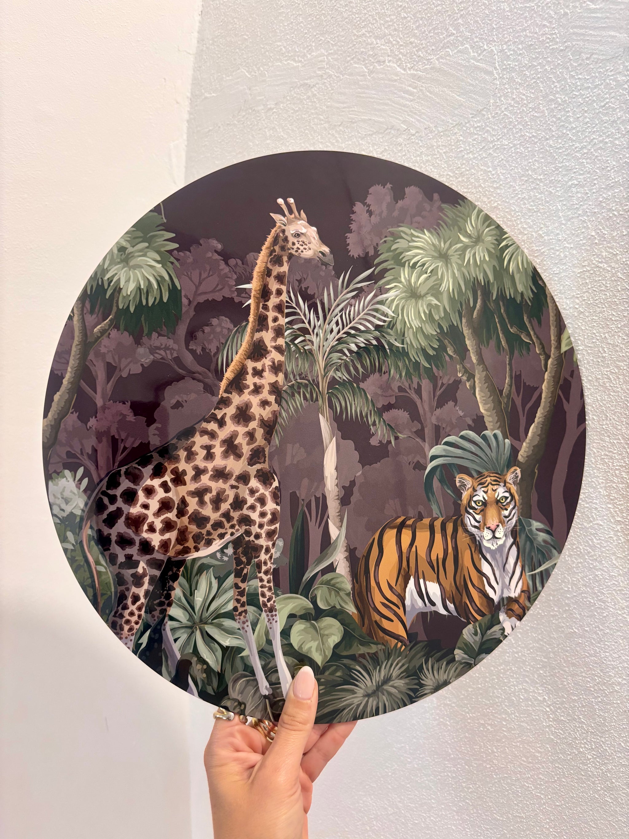 Un paesaggio esotico in quattro atmosfere diverse: giraffa e tigre si incontrano tra foglie lussureggianti, palme e uccelli tropicali in una scena dal forte impatto visivo.